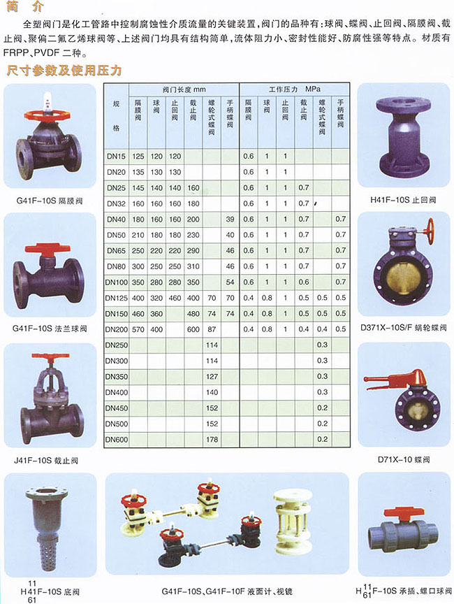 PP隔膜閥、球閥、底閥、止回閥、蝶閥等塑料閥門(mén)耐腐蝕、結♠∏♥構簡單、流體(tǐ)阻力小(xiǎo)、密封性能(n£<αéng)好(hǎo),廣泛用(yòng)于化(huà)工(gōng)、石油、氯堿、冶煉、制(zhì)藥、染料、食品≤✘"、電(diàn)鍍、環保等行(xíng)業(yè)。